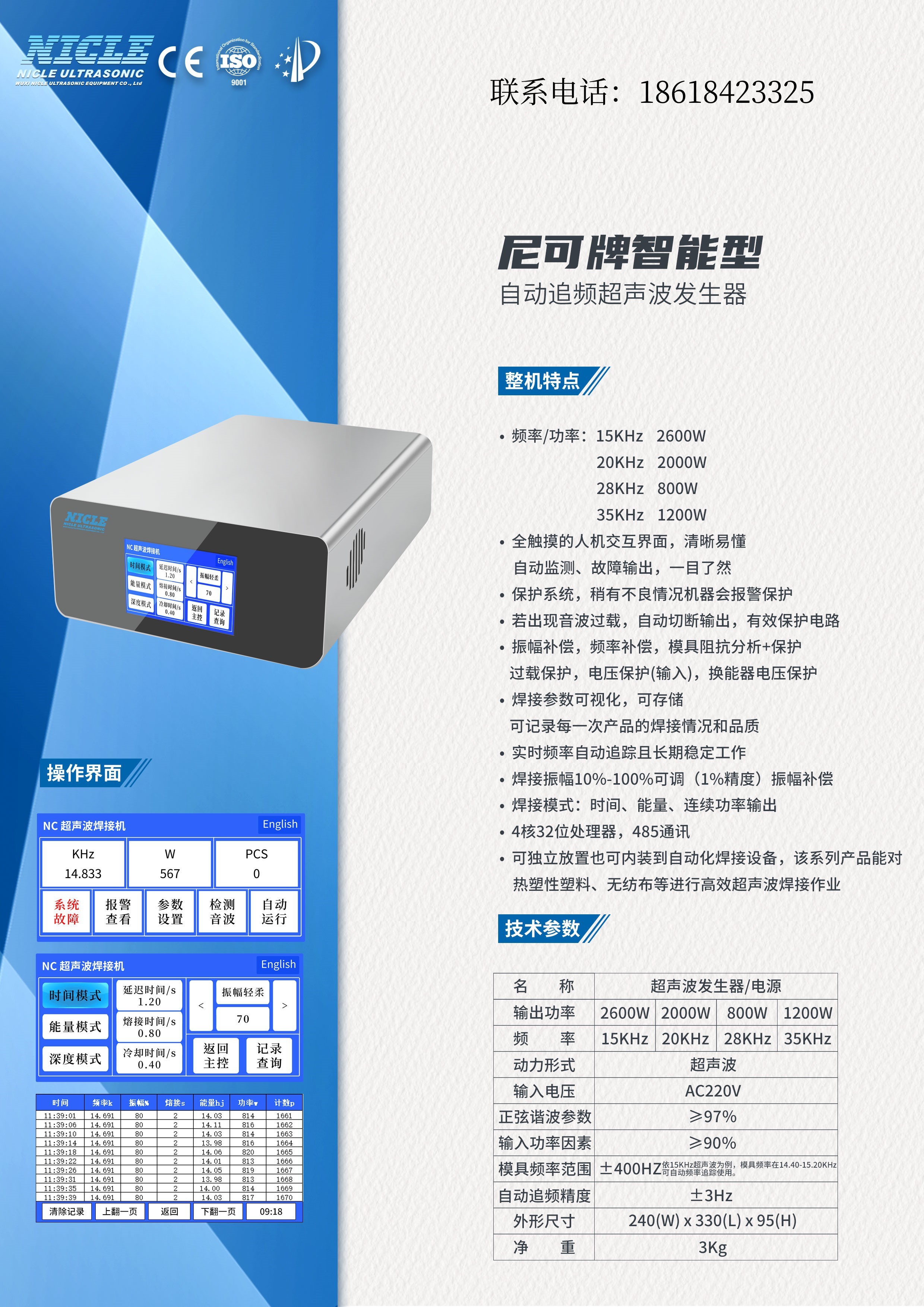輸出時間:0.01-3s 頻率自動追頻補償,焊頭頻率及時顯示, 出力調整,焊接時間可調